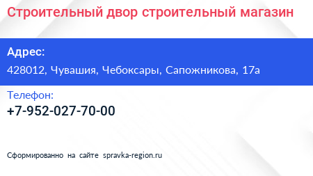 Строительный двор, строительный магазин по адресу 428012, Чувашия, Чебоксары, Сапожникова, 17а в дальнейшем Организация, размещена в следующих категориях: