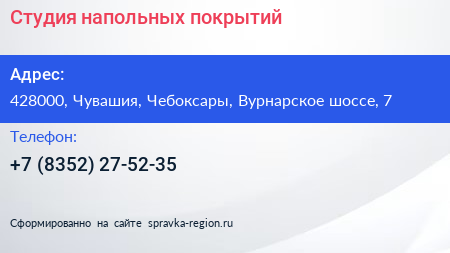 Студия напольных покрытий по адресу 428000, Чувашия, Чебоксары, Вурнарское шоссе, 7 в дальнейшем Организация, размещена в следующих категориях:
