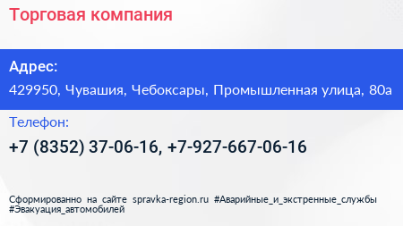 Торговая компания по адресу 429950, Чувашия, Чебоксары, Промышленная улица, 80а в дальнейшем Организация, размещена в следующих категориях: