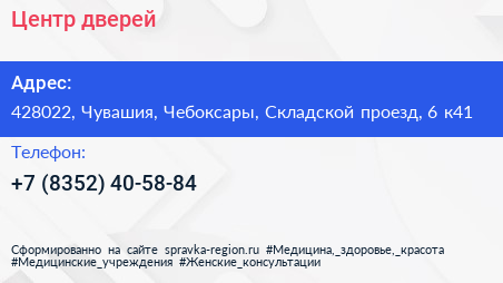 Центр дверей по адресу 428022, Чувашия, Чебоксары, Складской проезд, 6 к41 в дальнейшем Организация, размещена в следующих категориях: