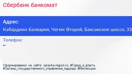 Сбербанк, банкомат по адресу Кабардино-Балкария, Чегем Второй, Баксанское шоссе, 33 в дальнейшем Организация, размещена в следующих категориях: