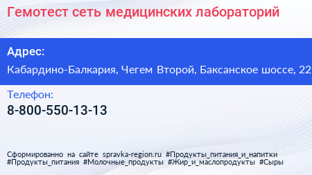 Гемотест, сеть медицинских лабораторий по адресу Кабардино-Балкария, Чегем Второй, Баксанское шоссе, 22 в дальнейшем Организация, размещена в следующих категориях: