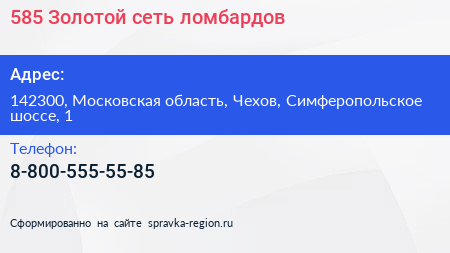 585*Золотой, сеть ломбардов по адресу 142300, Московская область, Чехов, Симферопольское шоссе, 1 в дальнейшем Организация, размещена в следующих категориях: