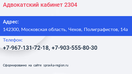 Адвокатский кабинет №2304 по адресу 142300, Московская область, Чехов, Полиграфистов, 14а в дальнейшем Организация, размещена в следующих категориях: