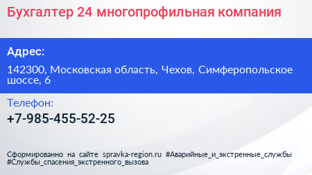 Бухгалтер-24, многопрофильная компания по адресу 142300, Московская область, Чехов, Симферопольское шоссе, 6 в дальнейшем Организация, размещена в следующих категориях: