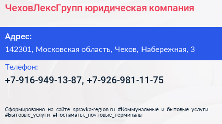 ЧеховЛексГрупп, юридическая компания по адресу 142301, Московская область, Чехов, Набережная, 3 в дальнейшем Организация, размещена в следующих категориях: