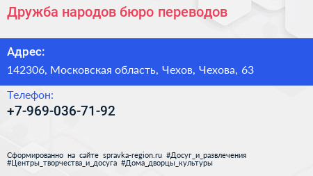Дружба народов, бюро переводов по адресу 142306, Московская область, Чехов, Чехова, 63 в дальнейшем Организация, размещена в следующих категориях: