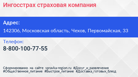 Ингосстрах, страховая компания по адресу 142306, Московская область, Чехов, Первомайская, 33 в дальнейшем Организация, размещена в следующих категориях: