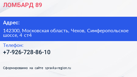 ЛОМБАРД 89 по адресу 142300, Московская область, Чехов, Симферопольское шоссе, 4 ст4 в дальнейшем Организация, размещена в следующих категориях: