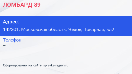 ЛОМБАРД 89 по адресу 142301, Московская область, Чехов, Товарная, вл2 в дальнейшем Организация, размещена в следующих категориях: