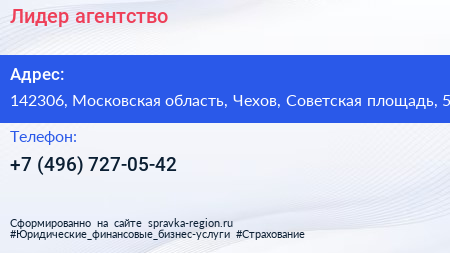 Лидер, агентство по адресу 142306, Московская область, Чехов, Советская площадь, 5 в дальнейшем Организация, размещена в следующих категориях: