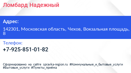 Ломбард Надежный по адресу 142301, Московская область, Чехов, Вокзальная площадь, 8 в дальнейшем Организация, размещена в следующих категориях: