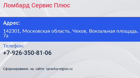 Ломбард Сервис Плюс по адресу 142301, Московская область, Чехов, Вокзальная площадь, 7а в дальнейшем Организация, размещена в следующих категориях:
