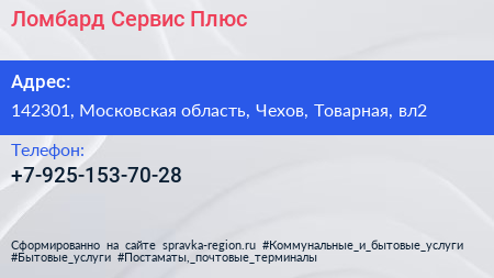 Ломбард Сервис Плюс по адресу 142301, Московская область, Чехов, Товарная, вл2 в дальнейшем Организация, размещена в следующих категориях: