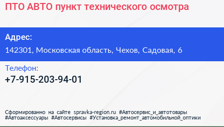 ПТО-АВТО, пункт технического осмотра по адресу 142301, Московская область, Чехов, Садовая, 6 в дальнейшем Организация, размещена в следующих категориях: