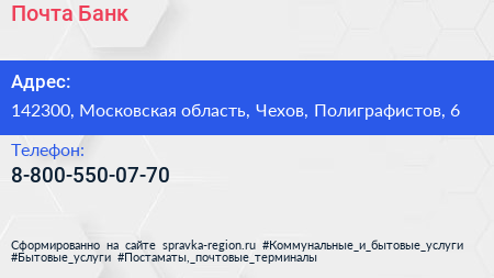 Почта Банк по адресу 142300, Московская область, Чехов, Полиграфистов, 6 в дальнейшем Организация, размещена в следующих категориях:
