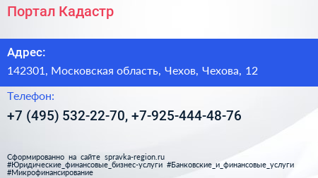 Портал Кадастр по адресу 142301, Московская область, Чехов, Чехова, 12 в дальнейшем Организация, размещена в следующих категориях: