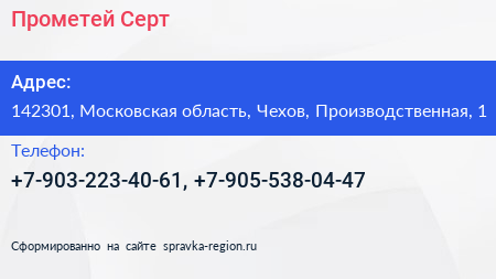 Прометей-Серт по адресу 142301, Московская область, Чехов, Производственная, 1 в дальнейшем Организация, размещена в следующих категориях: