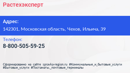 Растехэксперт по адресу 142301, Московская область, Чехов, Ильича, 39 в дальнейшем Организация, размещена в следующих категориях: