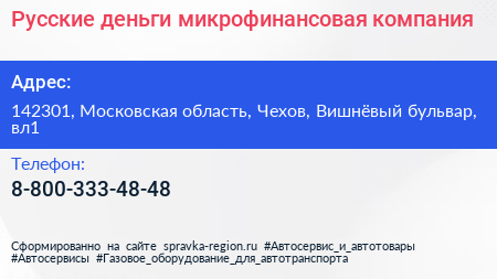 Русские деньги, микрофинансовая компания по адресу 142301, Московская область, Чехов, Вишнёвый бульвар, вл1 в дальнейшем Организация, размещена в следующих категориях: