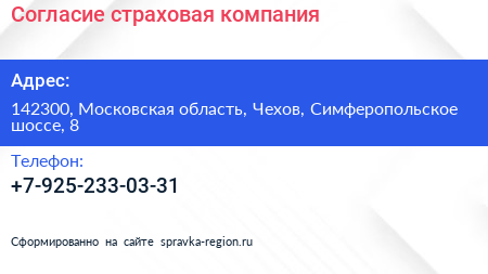 Согласие, страховая компания по адресу 142300, Московская область, Чехов, Симферопольское шоссе, 8 в дальнейшем Организация, размещена в следующих категориях: