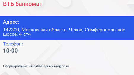 ВТБ, банкомат по адресу 142300, Московская область, Чехов, Симферопольское шоссе, 4 ст4 в дальнейшем Организация, размещена в следующих категориях: