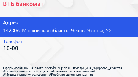 ВТБ, банкомат по адресу 142306, Московская область, Чехов, Чехова, 22 в дальнейшем Организация, размещена в следующих категориях: