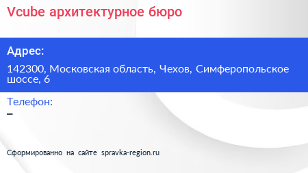 Vcube, архитектурное бюро по адресу 142300, Московская область, Чехов, Симферопольское шоссе, 6 в дальнейшем Организация, размещена в следующих категориях: