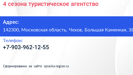 4 сезона, туристическое агентство по адресу 142300, Московская область, Чехов, Большая Каменная, 38 в дальнейшем Организация, размещена в следующих категориях: