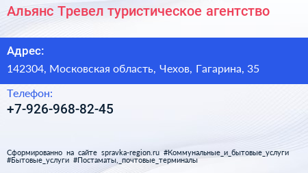 Альянс Тревел, туристическое агентство по адресу 142304, Московская область, Чехов, Гагарина, 35 в дальнейшем Организация, размещена в следующих категориях: