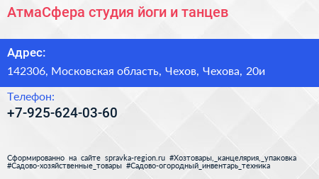 АтмаСфера, студия йоги и танцев по адресу 142306, Московская область, Чехов, Чехова, 20и в дальнейшем Организация, размещена в следующих категориях: