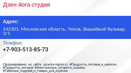 Дзен, йога-студия по адресу 142301, Московская область, Чехов, Вишнёвый бульвар, 3/1 в дальнейшем Организация, размещена в следующих категориях: