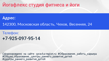 Йогафлекс, студия фитнеса и йоги по адресу 142300, Московская область, Чехов, Весенняя, 24 в дальнейшем Организация, размещена в следующих категориях: