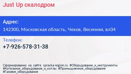 Just Up, скалодром по адресу 142300, Московская область, Чехов, Весенняя, вл34 в дальнейшем Организация, размещена в следующих категориях: