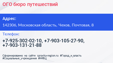 ОГО, бюро путешествий по адресу 142306, Московская область, Чехов, Почтовая, 8 в дальнейшем Организация, размещена в следующих категориях: