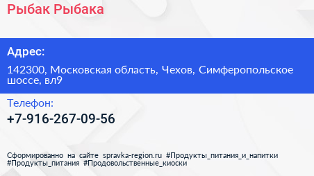 Рыбак-Рыбака по адресу 142300, Московская область, Чехов, Симферопольское шоссе, вл9 в дальнейшем Организация, размещена в следующих категориях: