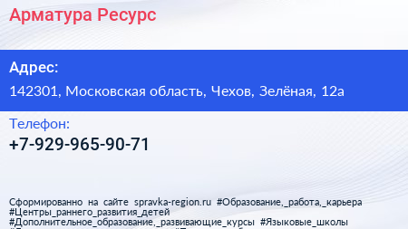 Арматура-Ресурс по адресу 142301, Московская область, Чехов, Зелёная, 12а в дальнейшем Организация, размещена в следующих категориях: