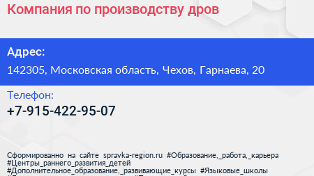 Компания по производству дров по адресу 142305, Московская область, Чехов, Гарнаева, 20 в дальнейшем Организация, размещена в следующих категориях: