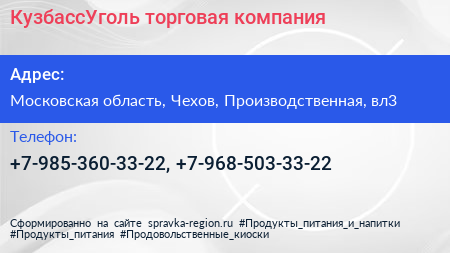 КузбассУголь, торговая компания по адресу Московская область, Чехов, Производственная, вл3 в дальнейшем Организация, размещена в следующих категориях: