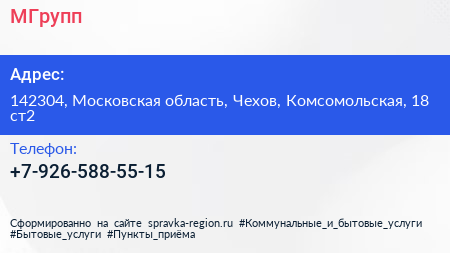 МГрупп по адресу 142304, Московская область, Чехов, Комсомольская, 18 ст2 в дальнейшем Организация, размещена в следующих категориях:
