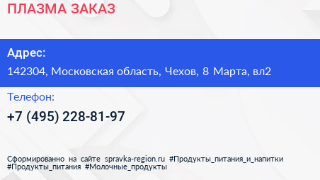 ПЛАЗМА ЗАКАЗ по адресу 142304, Московская область, Чехов, 8 Марта, вл2 в дальнейшем Организация, размещена в следующих категориях:
