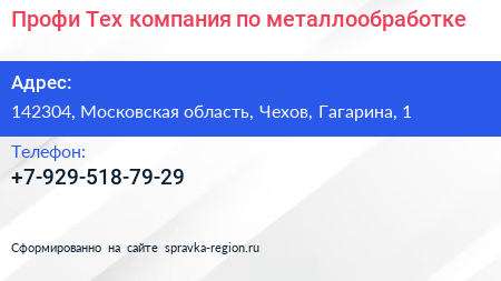 Профи Тех, компания по металлообработке по адресу 142304, Московская область, Чехов, Гагарина, 1 в дальнейшем Организация, размещена в следующих категориях: