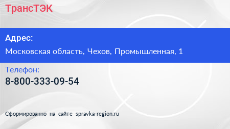 ТрансТЭК по адресу Московская область, Чехов, Промышленная, 1 в дальнейшем Организация, размещена в следующих категориях: