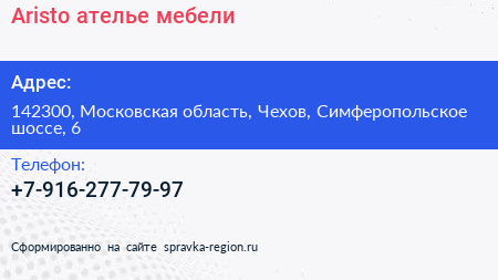 Aristo, ателье мебели по адресу 142300, Московская область, Чехов, Симферопольское шоссе, 6 в дальнейшем Организация, размещена в следующих категориях: