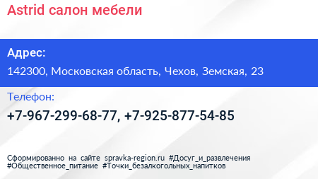 Astrid, салон мебели по адресу 142300, Московская область, Чехов, Земская, 23 в дальнейшем Организация, размещена в следующих категориях: