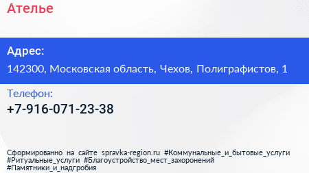 Ателье по адресу 142300, Московская область, Чехов, Полиграфистов, 1 в дальнейшем Организация, размещена в следующих категориях: