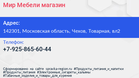 Мир Мебели, магазин по адресу 142301, Московская область, Чехов, Товарная, вл2 в дальнейшем Организация, размещена в следующих категориях: