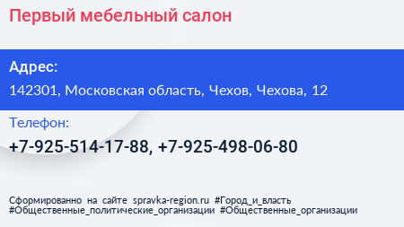 Первый мебельный, салон по адресу 142301, Московская область, Чехов, Чехова, 12 в дальнейшем Организация, размещена в следующих категориях: