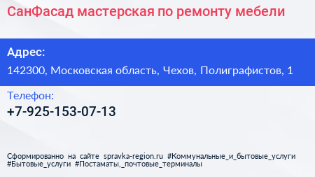 СанФасад, мастерская по ремонту мебели по адресу 142300, Московская область, Чехов, Полиграфистов, 1 в дальнейшем Организация, размещена в следующих категориях: