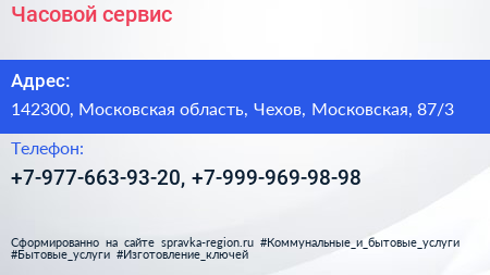 Часовой сервис по адресу 142300, Московская область, Чехов, Московская, 87/3 в дальнейшем Организация, размещена в следующих категориях: